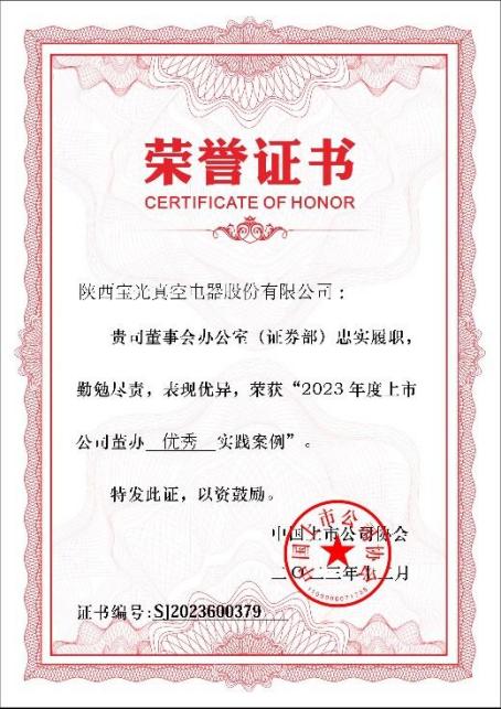 自寶光股份上市以來,董事會與管理層高度重視各項工作,董辦團(tuán)隊切實關(guān)注各項履職能力提升,堅守初心,嚴(yán)格按照法律法規(guī)開展各項工作。獲得此項榮譽(yù)充分體現(xiàn)了中國上市公司協(xié)會對寶光股份董事會辦公室信息披露管理、治理機(jī)制建設(shè)、投資者關(guān)系管理、相關(guān)制度制定修訂、ESG管理披露、監(jiān)督培訓(xùn)等各項工作成果的高度認(rèn)可和充分肯定。