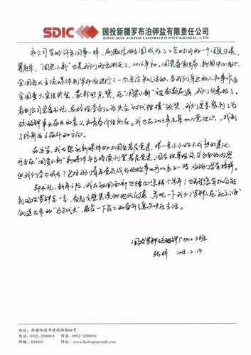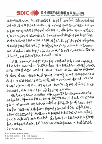 這封寫給郝鵬書記的信,來自國投新疆羅布泊鉀鹽有限責(zé)任公司硫酸鉀廠加工車間加工三班的一位普通青年員工。