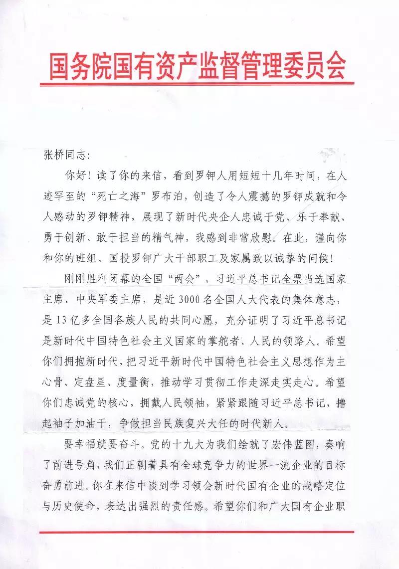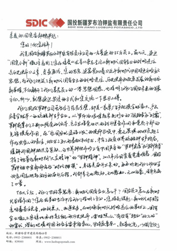 我是國投新疆羅布泊鉀鹽有限責(zé)任公司的一名普通的85后員工。前幾天,通過“國資小新”微信看到了您在接受《求是》雜志專訪的《新時代國有企業(yè)的戰(zhàn)略定位與歷史使命》文章,受益匪淺。您的思考,通篇貫徹著習(xí)近平新時代中國特色社會主義思想,為我們講述了新時代國有企業(yè)的戰(zhàn)略定位、歷史使命和改革發(fā)展的新目標(biāo)新舉措,不僅解開了我們基層員工的一些思想困惑,也指明了我們國企未來的發(fā)展方向。所以,就想通過寫信的方式和您交流一下學(xué)習(xí)心得。
