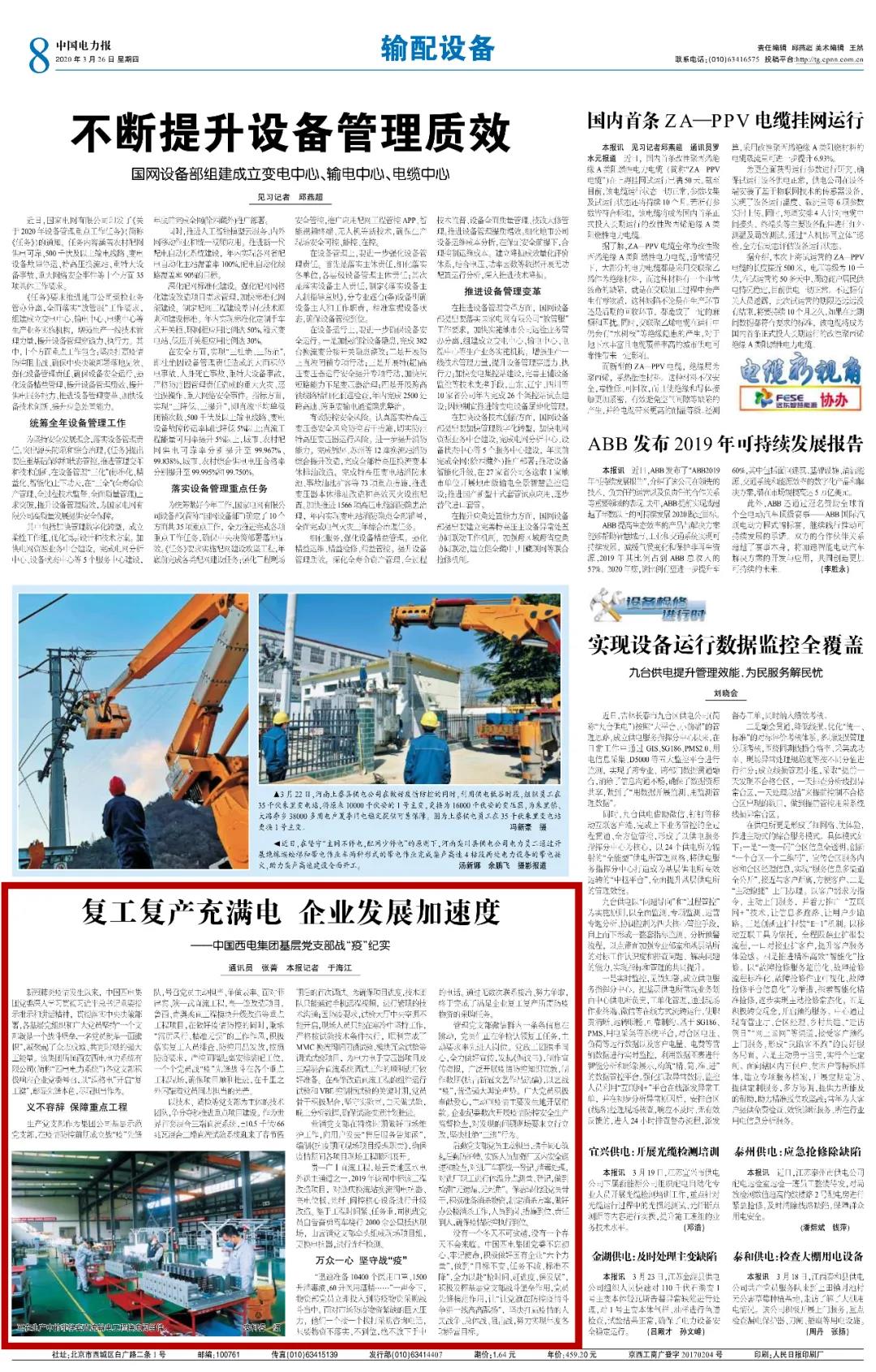 近日,中國電力報刊登了《復(fù)工復(fù)產(chǎn)充滿電 企業(yè)發(fā)展加速度——中國西電集團(tuán)基層黨支部復(fù)產(chǎn)復(fù)工戰(zhàn)“疫”紀(jì)實》一文,文章展示了中國西電集團(tuán)基層黨支部積極響應(yīng)企業(yè)黨委號召,以“滿格電”開啟“復(fù)工鍵”,勇挑重?fù)?dān),盡現(xiàn)擔(dān)當(dāng)作為的先鋒本色。